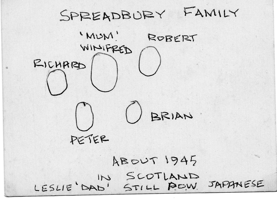 At the end of 1941, Singapore itself was bombed and I remember standing outside our quarters in Changi on the opposite side of the island, with Dad, watching the flashes and Dad saying “It looks like the balloon has gone up” After that he was gone for long periods at a time, apparently defusing unexploded bombs. He would come home at intervals for a change of clothes and a meal while Mum took care of the boys.
